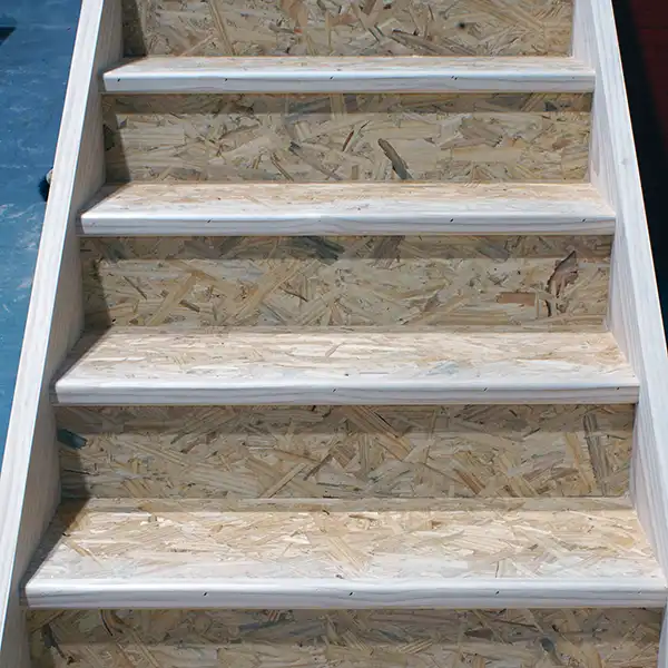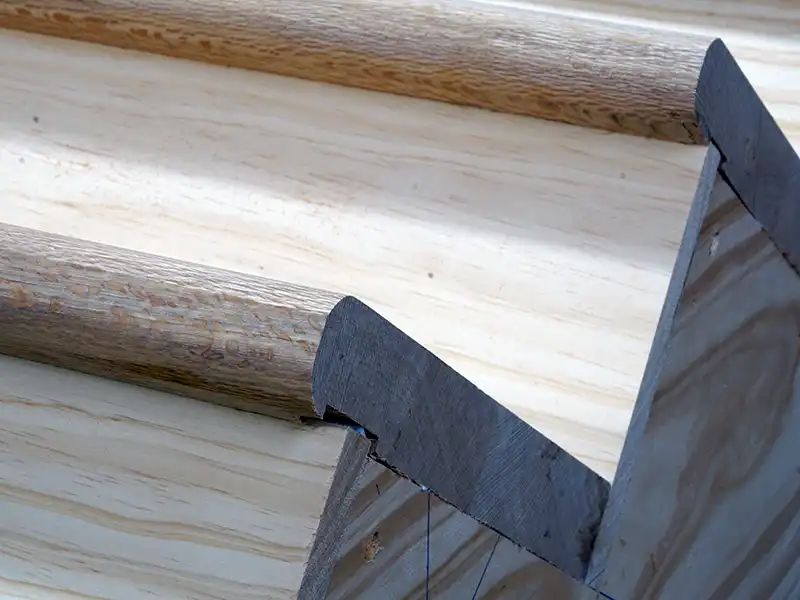 Our treads and risers are 21mm thick tri-board. All treads and risers are firmly wedged so they are strong and guaranteed not to squeak. We place a pine nosing on the front of each tread suitable for your choice of carpet finish.
